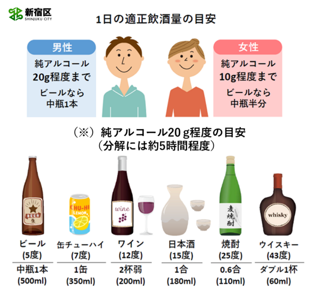 飲酒量は、飲んだお酒に含まれる純アルコール量を基準として考えます。1日の適正飲酒量の目安は、男性では純アルコール20g程度まで、女性では10g程度ですが、この範囲内でも連日の飲酒は(耐性形成から長期的には飲酒量の漸増が予想されるため)好ましくありません。新宿区のホームページの解説がわかりやすいので、気になる方は御参照ください(以下の図も引用の上、分解時間の目安も追記させていただきました。)。