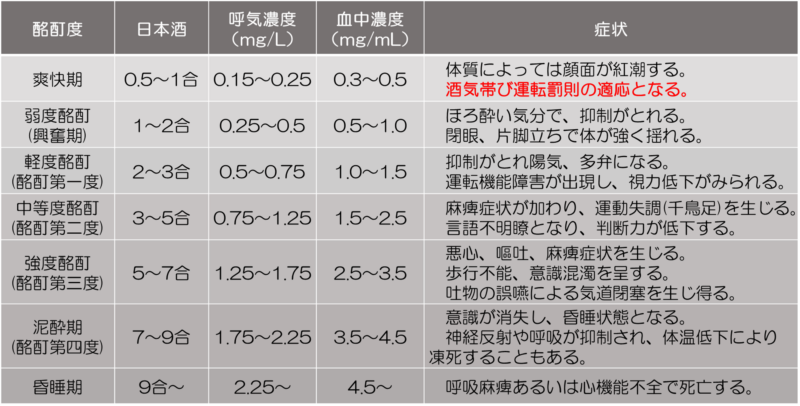 高速度に関しては、運転経験がある方でしたら、危険度も直感できると思います。一方で、アルコールの呼気濃度は、飲酒量や酩酊度との関係がよくわからない方が多いと思いますので、以下の表にまとめてみました。簡単に言えば、日本酒1合、ビール500 mlでも飲酒運転になるということですが、もちろん、それ未満であれば良いというわけではないので、御留意ください(高速度についても、飲酒についても、数値基準が甘いという批判も多いです。)。