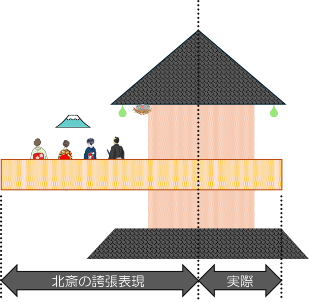 本図では、軒がかなり短く、回廊は屋根の外に大きくはみ出しています。おそらく、北斎は極端に短くした軒の延長線上に富士を配置したかったのでしょう。軒の先端の風鐸も、富士に視線を誘導する目的があると思われます。同時に空の面積も大きくとれるため、開放感も演出されます。さらに、過剰に広げられた回廊(濡れ縁)には、実際よりも大勢の人々を横一列に並べられ、ここでも富士への視線誘導が強化されています。