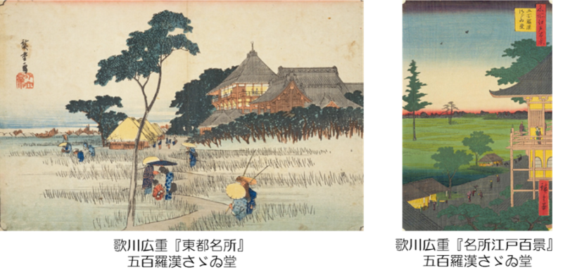 画題の五百羅漢寺とは、亀戸村、現在の東京都江東区大島三丁目にあった禅宗の一つである黄檗宗の寺院で、現在は下目黒に移転しています。本図は、この境内に寛保元年(1741年)に建立された三匝堂(さんそうどう)からの眺望が描かれています。