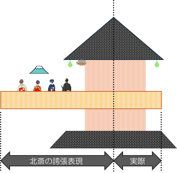 本図では、軒がかなり短く、回廊は屋根の外に大きくはみ出しています。おそらく、北斎は極端に短くした軒の延長線上に富士を配置したかったのでしょう。軒の先端の風鐸も、富士に視線を誘導する目的があると思われます。同時に空の面積も大きくとれるため、開放感も演出されます。さらに、過剰に広げられた回廊(濡れ縁)には、実際よりも大勢の人々を横一列に並べられ、ここでも富士への視線誘導が強化されています。