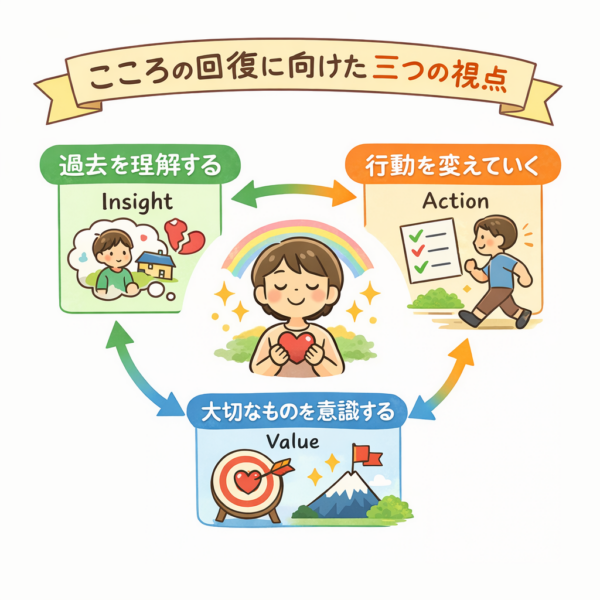 こころの回復は、過去を理解することと少しずつ行動を変えていくことの両方によって進んでいきます。さらに、自分にとって大切なものや価値観を意識することで、理解と行動の方向をよりはっきりと示すことができます。自分の体験を理解しながら、大切なものを見つめ直し、その方向に向かって小さな行動を積み重ねていくことが、こころの回復につながります。