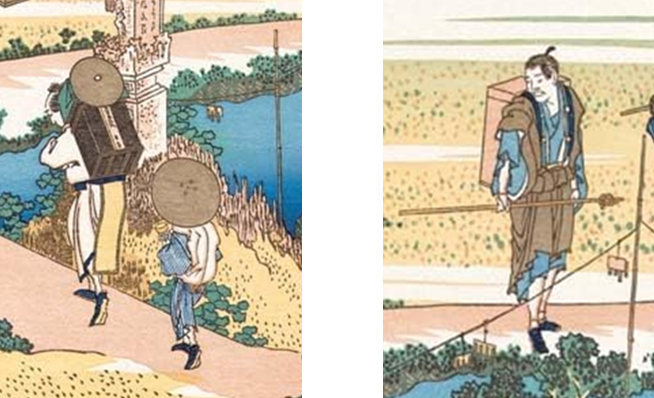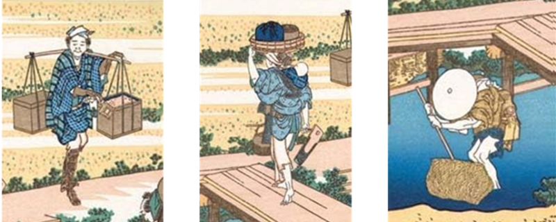 とりわけ橋を渡る女性は、裸足で子を背負いながら頭に桶を乗せ、鍬の柄にやかんを掛けて不安定な板橋を渡っており、その姿から当時の労働の厳しさがうかがえます。江戸時代には飢饉により農民一揆がたびたび発生するなど、農村の生活は決して安定したものではありませんでした。北斎は、こうした現実を、幕府批判と受け取られないかたちで、さりげなく江戸の人々に伝えようとしたのかもしれません。