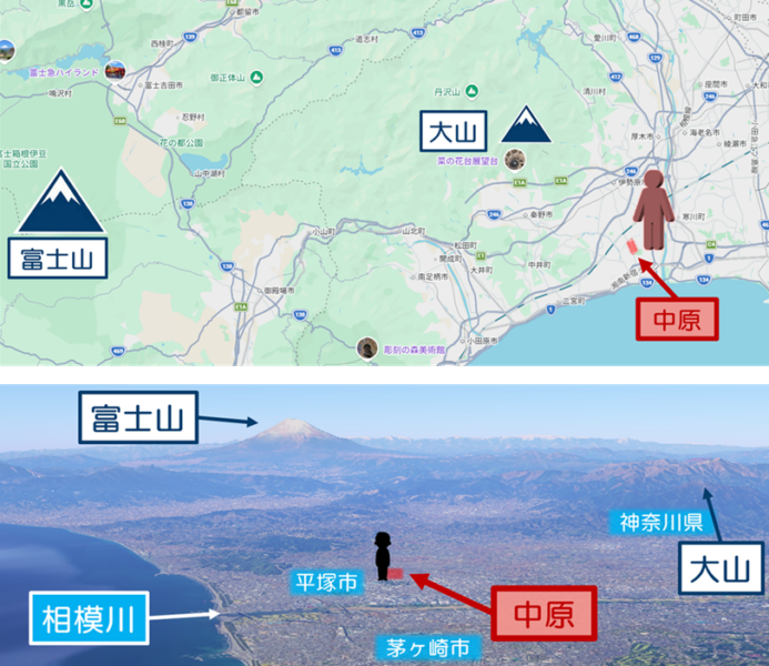本図は、現在の神奈川県平塚市中原、すなわち相模平野中央部に位置する中原宿周辺を描いたものです。ここは江戸へ通じる中原道と、大山参詣に用いられた大山道とが交差する交通の要衝であり、渋田川越しに富士を望む構図をとっていると考えられます。