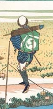 さらに、版元永寿堂(西村屋与八の屋号)の家紋である「山形に巴紋」が入った風呂敷を背負い、富士を眺める男性の姿も描かれています。